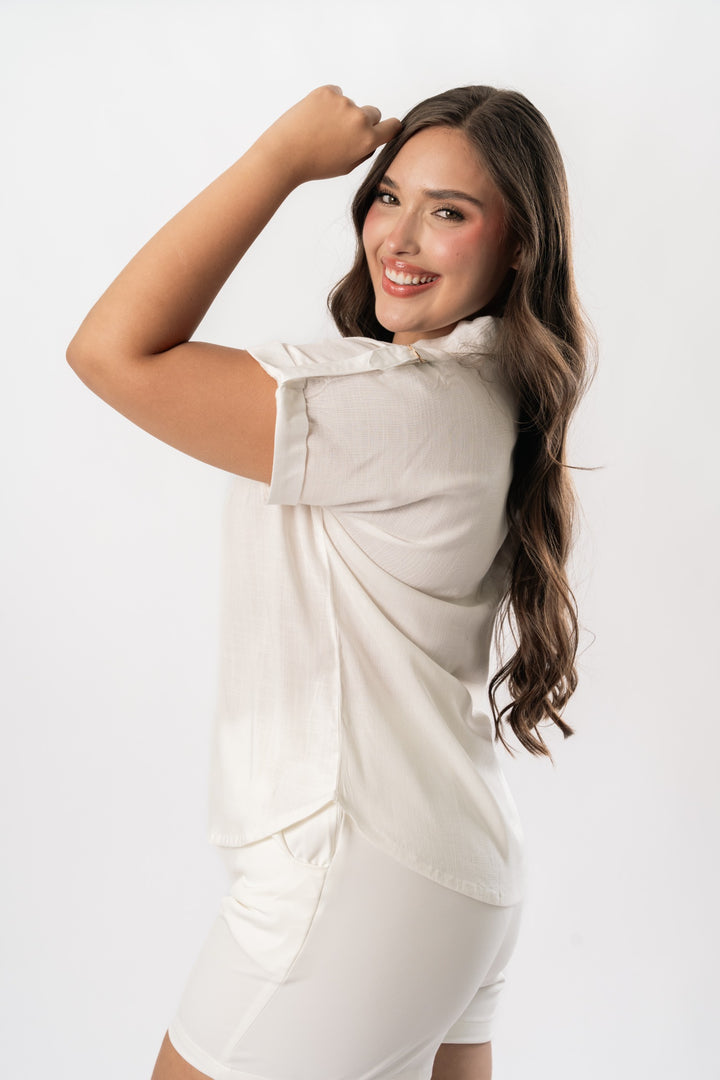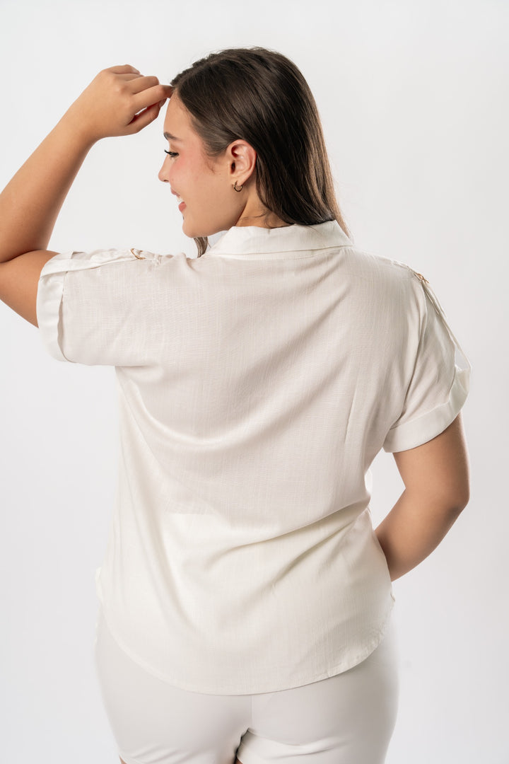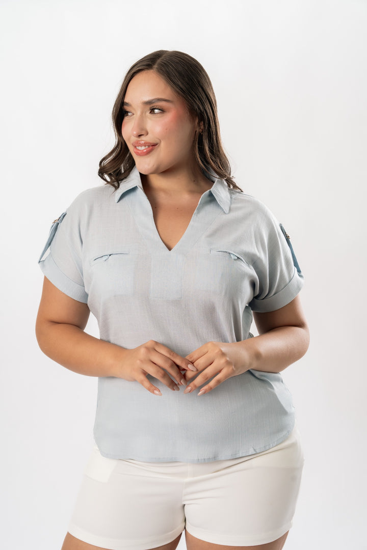 Blusa en lino licrado, con bolsillos, charreteras en hombros.