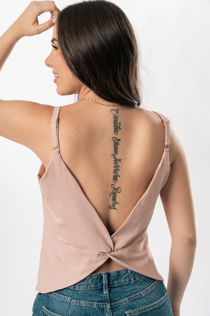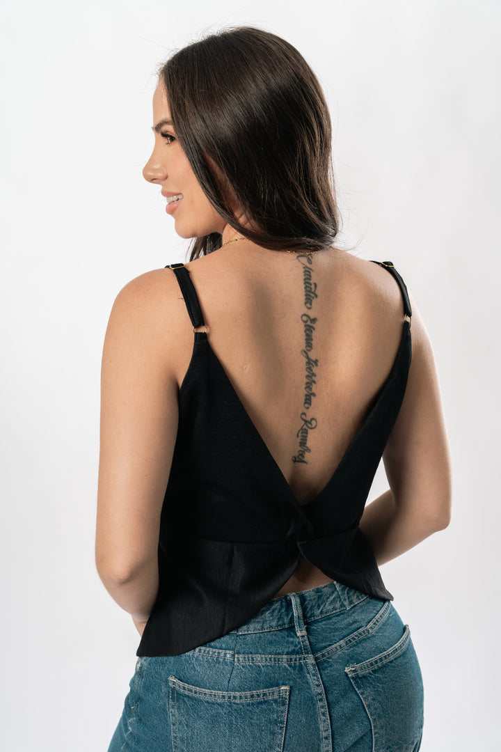 Blusa en tela lame Keops ritz con escote en espalda de tiras con silueta suelta.