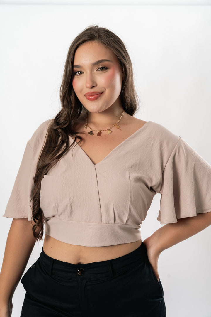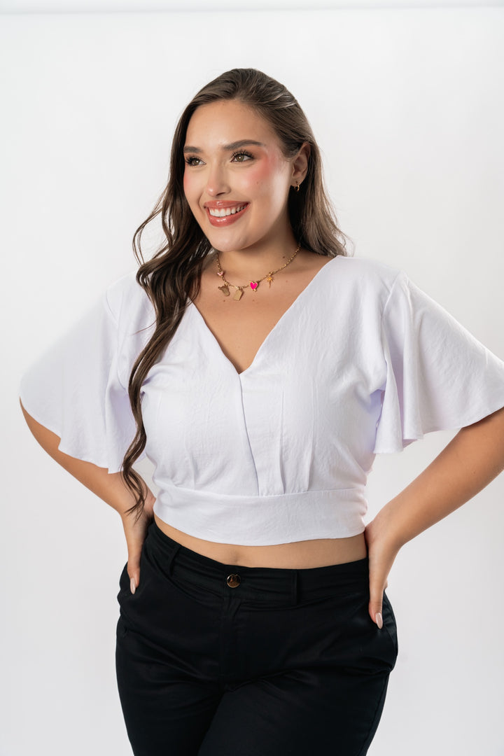 Blusa en tela corrugada, manga bolero y escote en espalda .