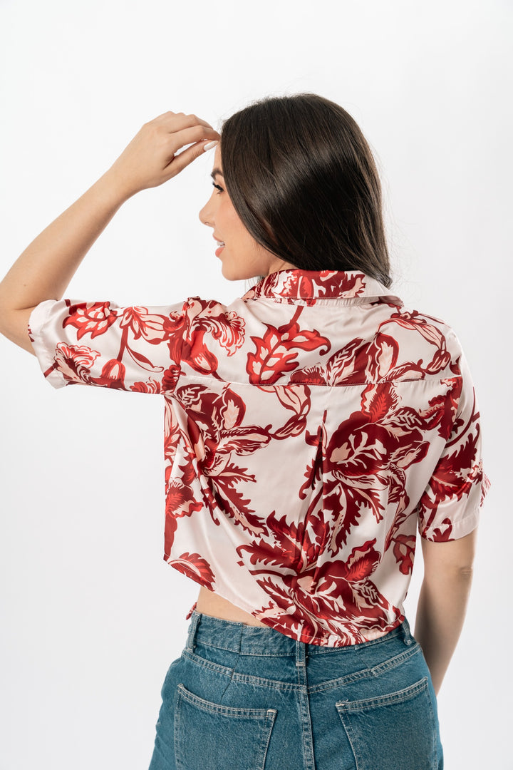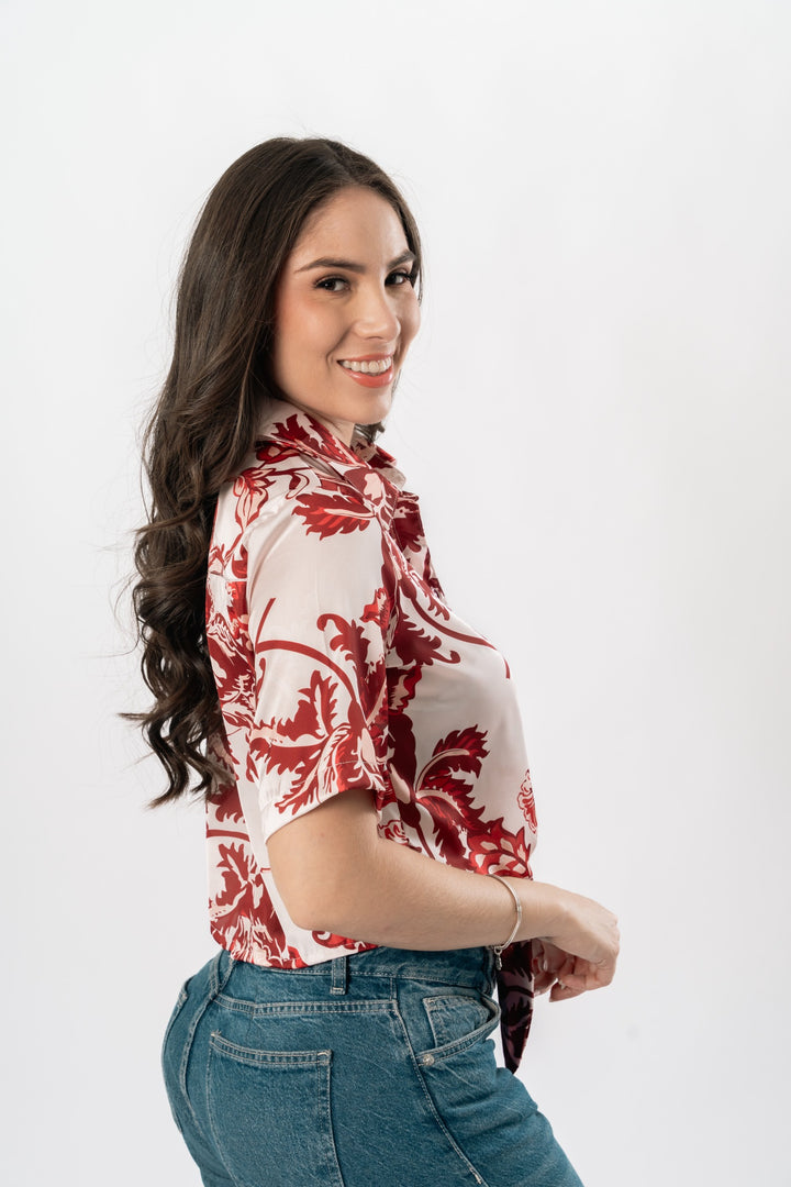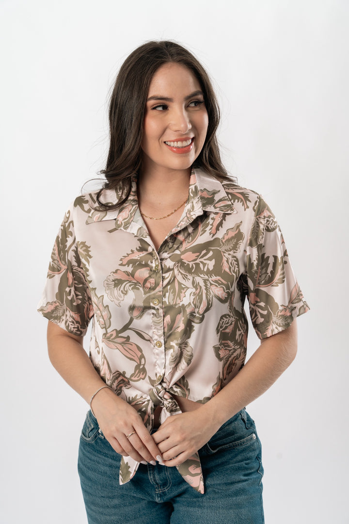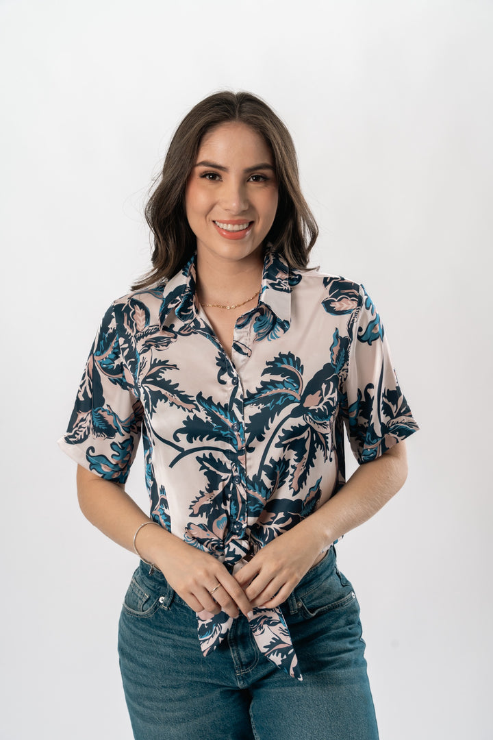 Camisa tres cuartos, en tela Santín con amarre en frente.