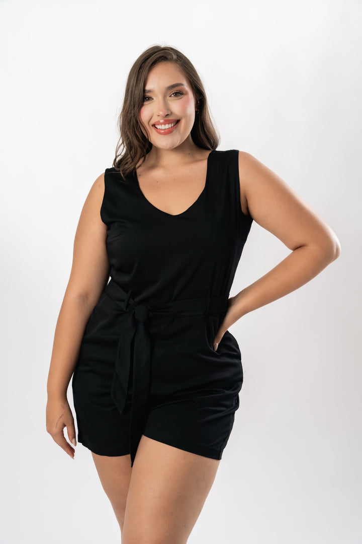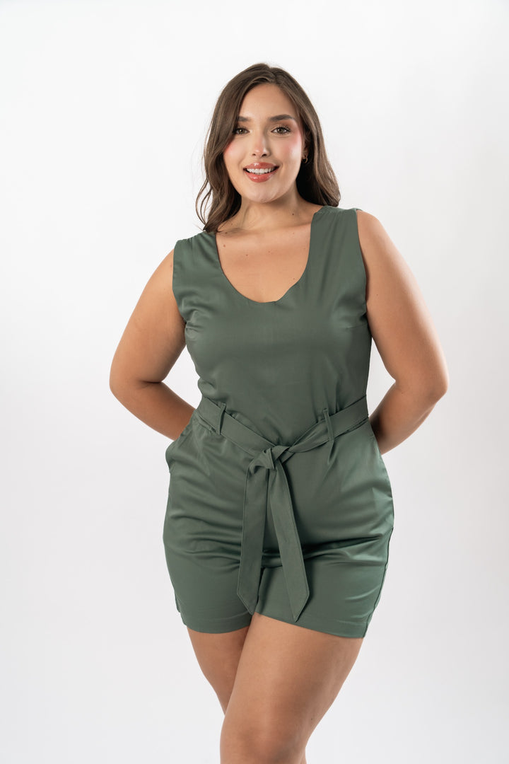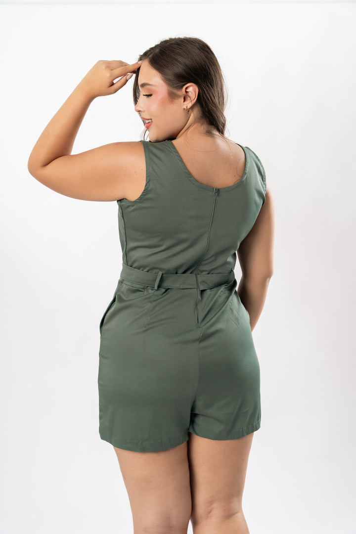 Enterizo en tela chalis con cinturón y bolsillos