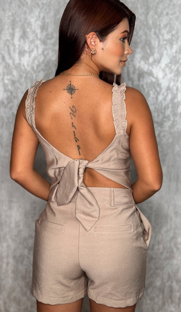 Set en tela Chalis, short clásico con bolsillos. Crop top graduable en frente.