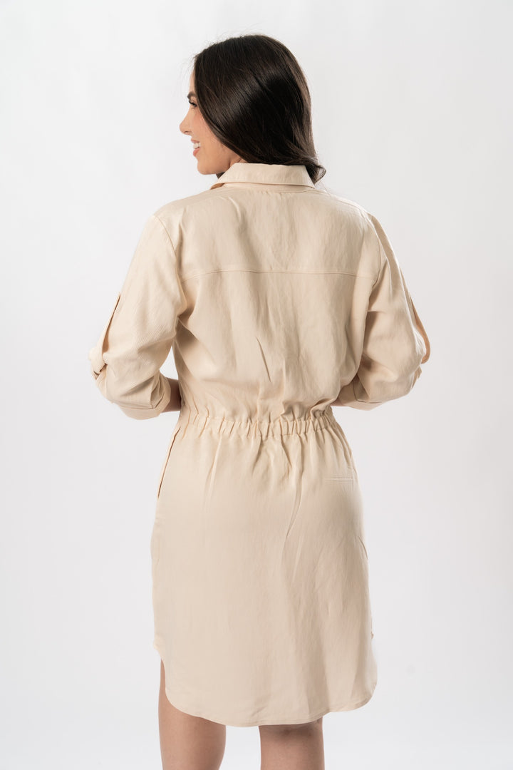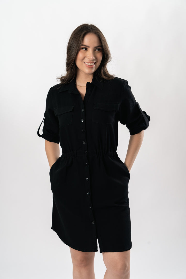 Vestido camisero en tela chalis con bolsillos elásticos en cintura